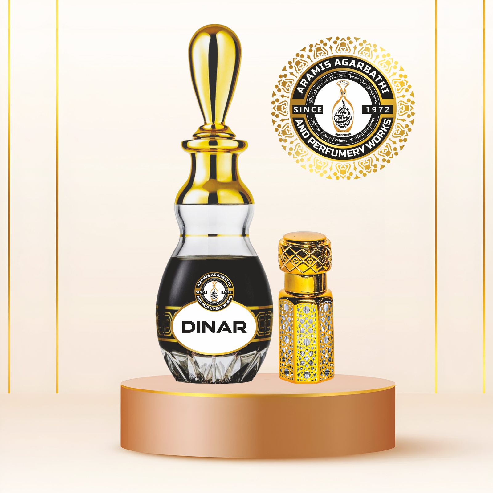Dinar is a premium oriental perfume crafted with deep oud, warm amber, exotic spices, and a touch of sweet musk. This fragrance embodies richness, royalty, and confidence — inspired by traditional Arabic luxury scents.